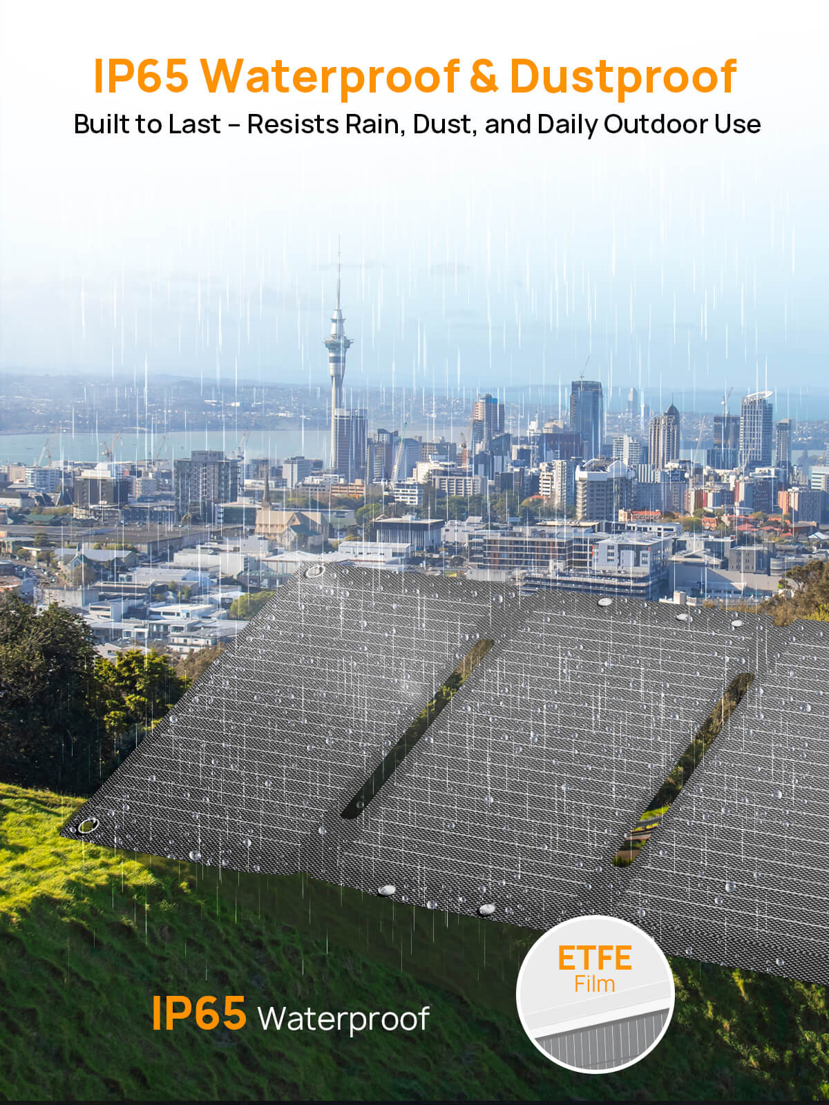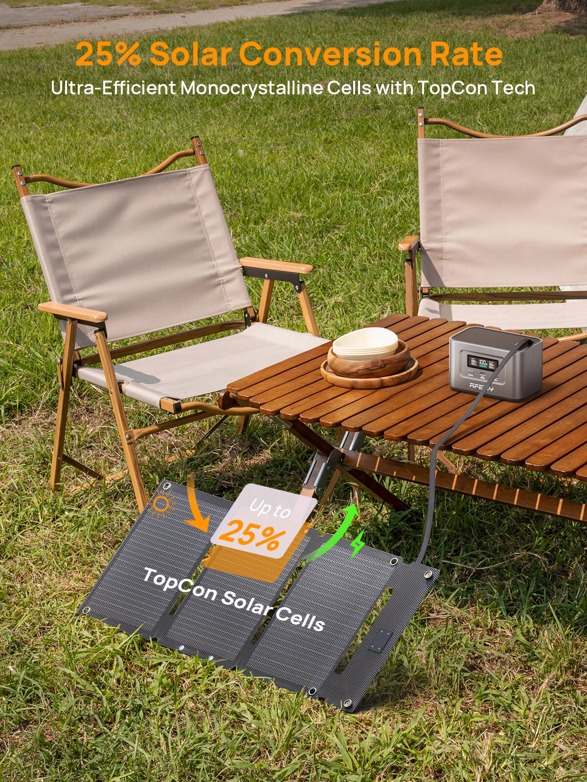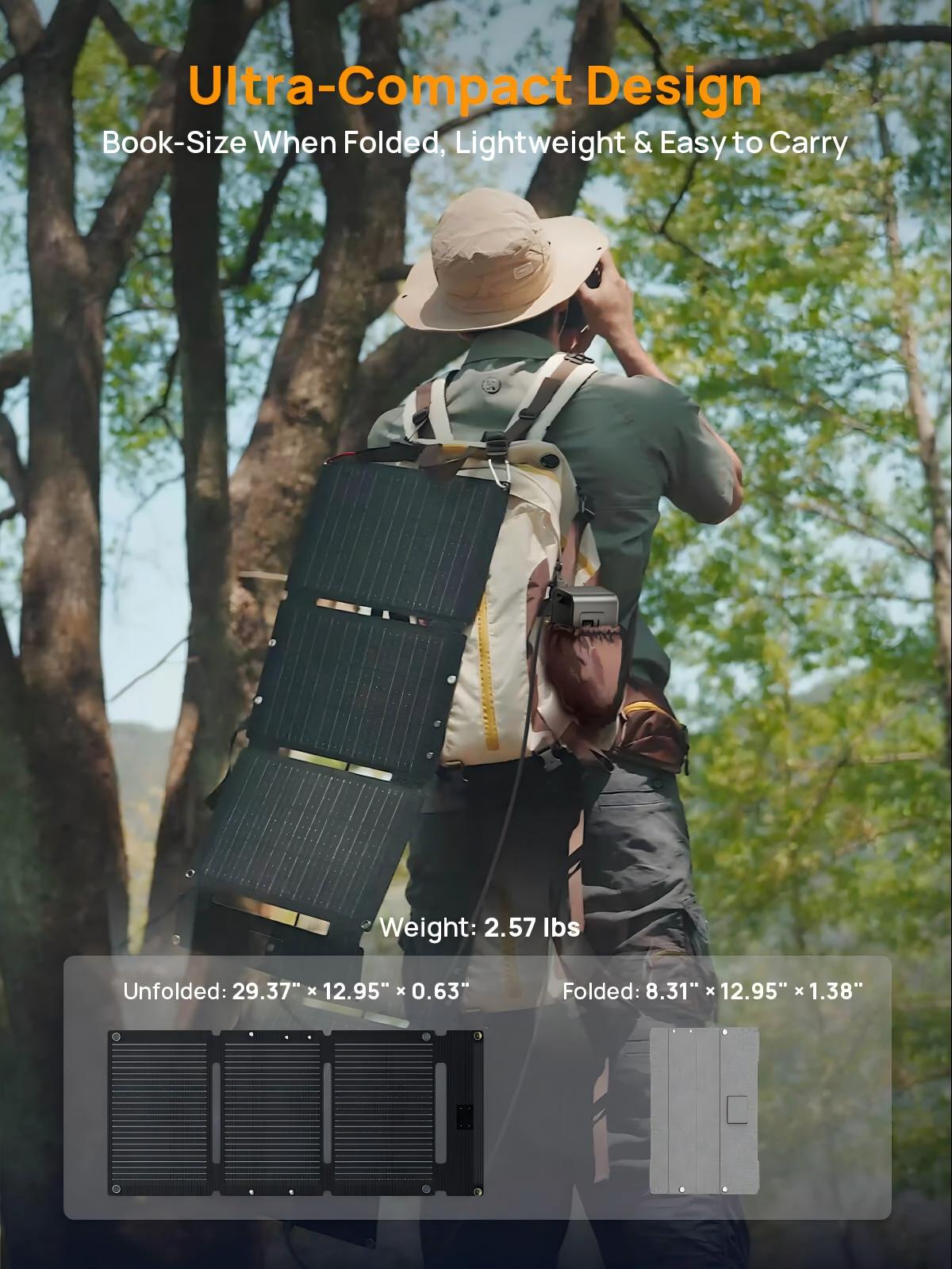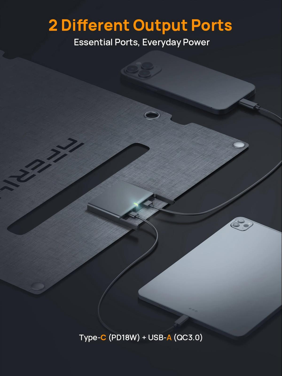 - 30W Foldable Solar Panel: Compact and travel-ready, 23% efficiency, with USB-A + USB-C ports to charge two devices.