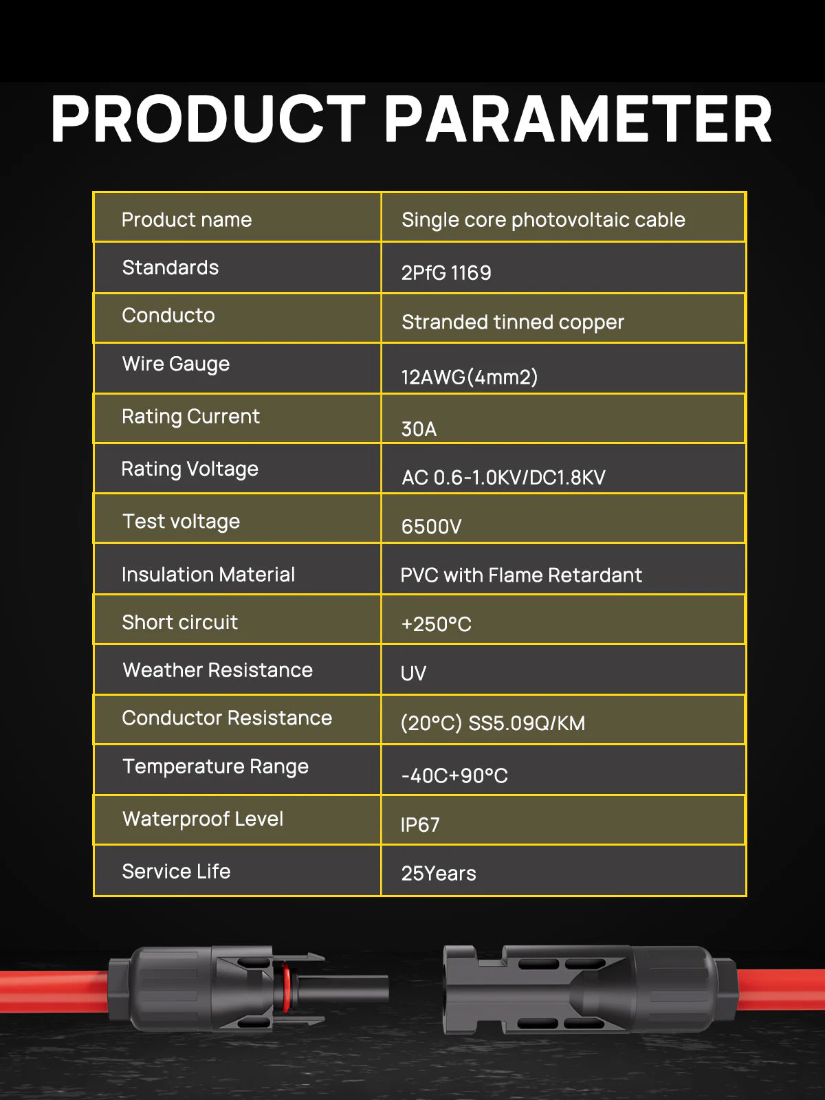 The solar panel extension cable is made of tinned conductive copper material to ensure good electrical conductivity and the solar connector shell is made of PP insulating material with excellent anti-ageing and UV resistance.